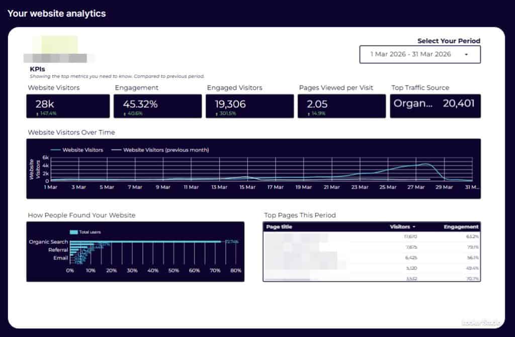 Your website data, without the extra login. Your analytics are embedded directly in your dashboard. You don’t need a separate Google account or a separate tool to check how your site is performing. It’s your data, in one place, every time you log in.
