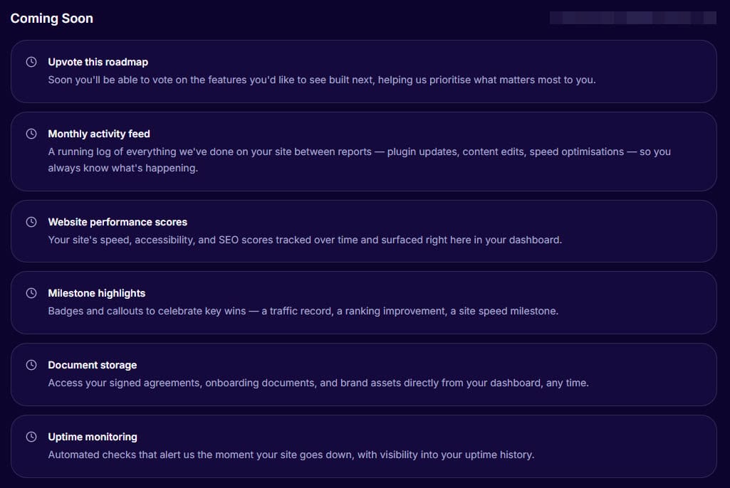 You know what’s coming. There’s a live roadmap so you can see what I’m working on next, for your site and for the dashboard itself. I think clients deserve to know where things are headed, not just where they’ve been.